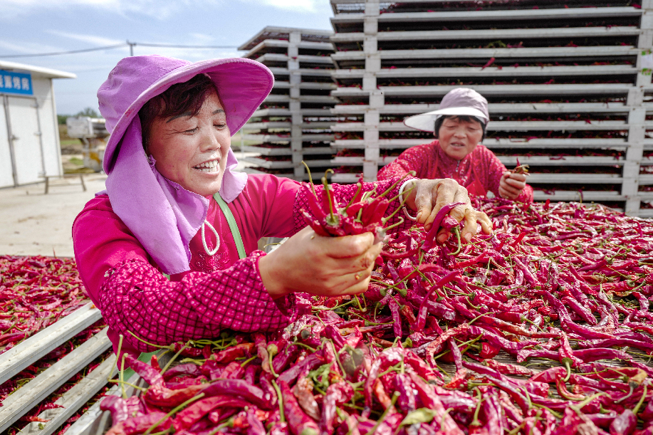 ????2018年拍攝于陜西興平桑鎮西橋村金鵬辣蒜專業合作社,農民分揀辣椒,辣椒品質優良,農民喜上眉梢。(組照2)張綺云 攝