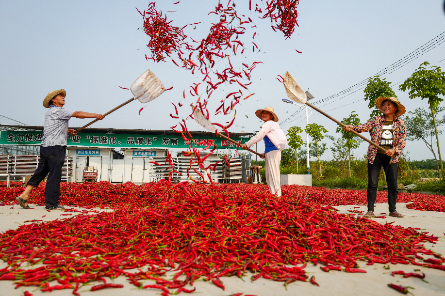 ??????2020年拍攝于陜西興平桑鎮西橋村金鵬辣蒜專業合作社,農民將辣椒揚起晾曬。(組照4)張綺云 攝