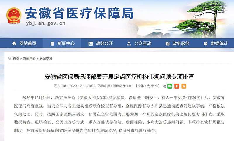 據(jù)安徽省醫(yī)保局網(wǎng)站消息,2020年12月14日,新京報報道《安徽太和多家醫(yī)院疑騙保:沒病變“腦梗”,有人一年免費住院9次》后,安徽省醫(yī)保局高度重視,當天立即與省衛(wèi)健委組成聯(lián)合檢查督導組,全程跟蹤督導太和縣迅速徹底查清違規(guī)事實,嚴格依法依規(guī)處理。