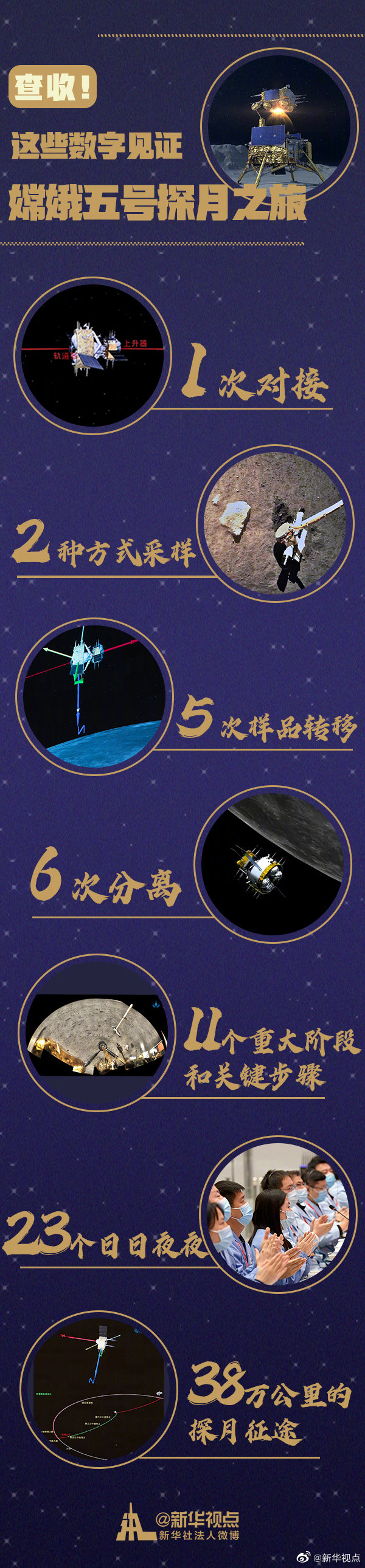 1、2、5、6、11、23、38……1次對接,2種方式采樣,5次樣品轉移,6次分離,11個重大階段和關鍵步驟,23個日日夜夜,38萬公里的探月征途!轉發!收藏!