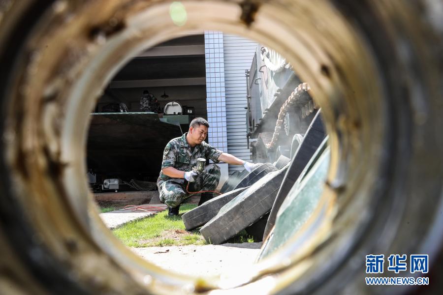 陸軍第72集團軍某旅四級軍士長譚斌在車場維護保養(yǎng)裝備(2019年9月20日攝)。新華社發(fā)(王勝強 攝)
