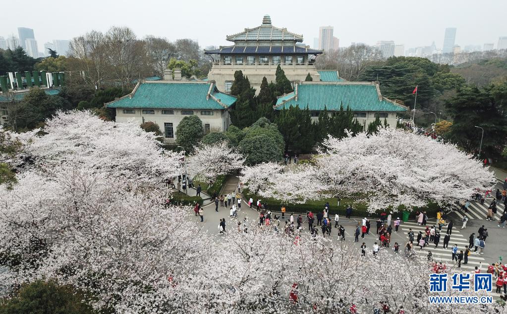 3月13日,武漢大學抗疫醫護人員賞櫻專場啟動,來自全國各地的援鄂抗疫英雄在櫻花樹下重逢,盡享櫻花之約(無人機照片)。新華社記者 程敏 攝
