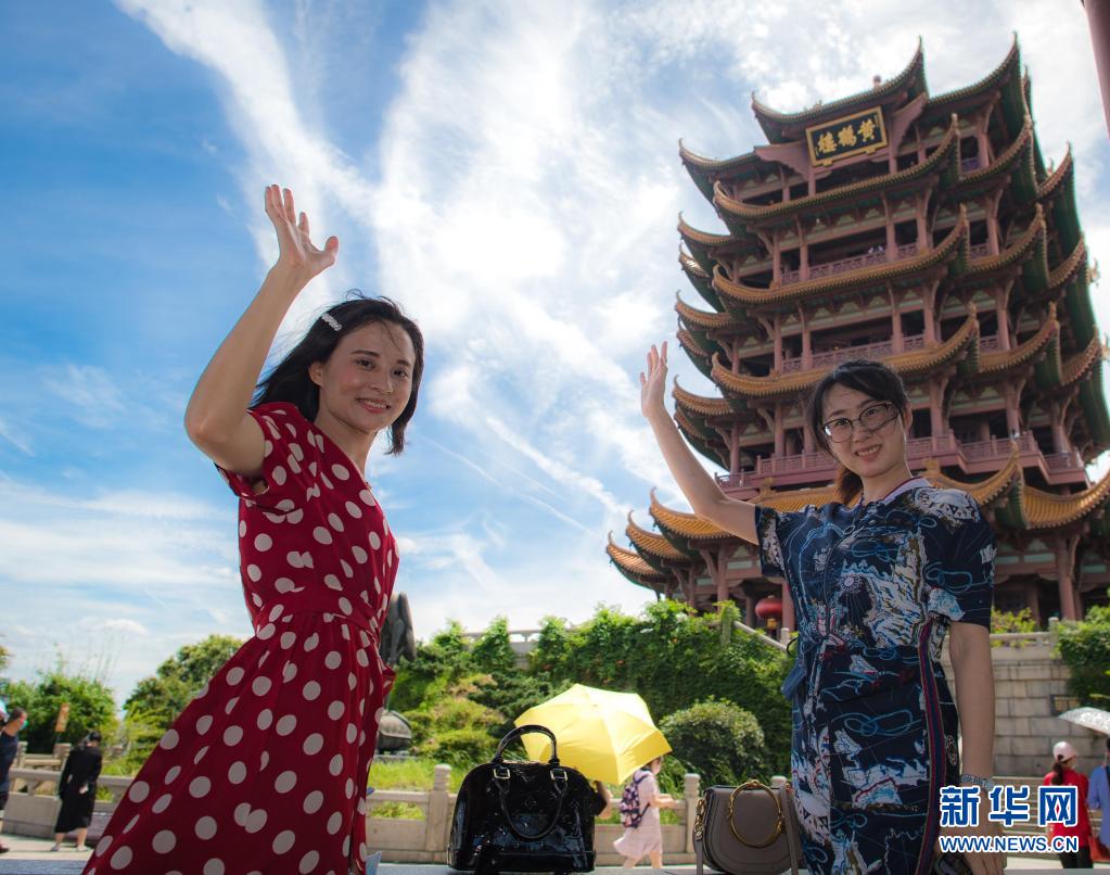 2020年8月7日,受邀來湖北旅游的海南援鄂醫療隊員陳小妹(左)與同事計超在黃鶴樓景區觀光。湖北省組織“與愛同行 惠游湖北”活動,陸續邀請援鄂醫護人員代表以及湖北醫護人員、社區工作者、志愿者等走進景區,飽覽荊楚風貌。新華社記者 肖藝九 攝