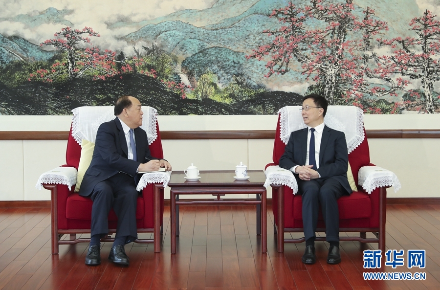 4月22日,中共中央政治局常委、國務(wù)院副總理韓正在廣州會(huì)見前來參加粵港澳大灣區(qū)建設(shè)領(lǐng)導(dǎo)小組會(huì)議的澳門特別行政區(qū)行政長(zhǎng)官賀一誠。 新華社記者姚大偉攝