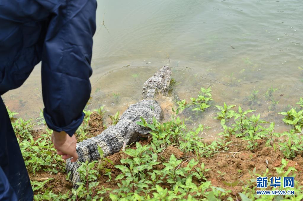 5月13日,工作人員放歸揚子鱷。當日,安徽揚子鱷國家級自然保護區(qū)在涇縣雙坑片區(qū)揚子鱷核心棲息地放歸51條人工繁育揚子鱷。 新華社記者 韓旭 攝