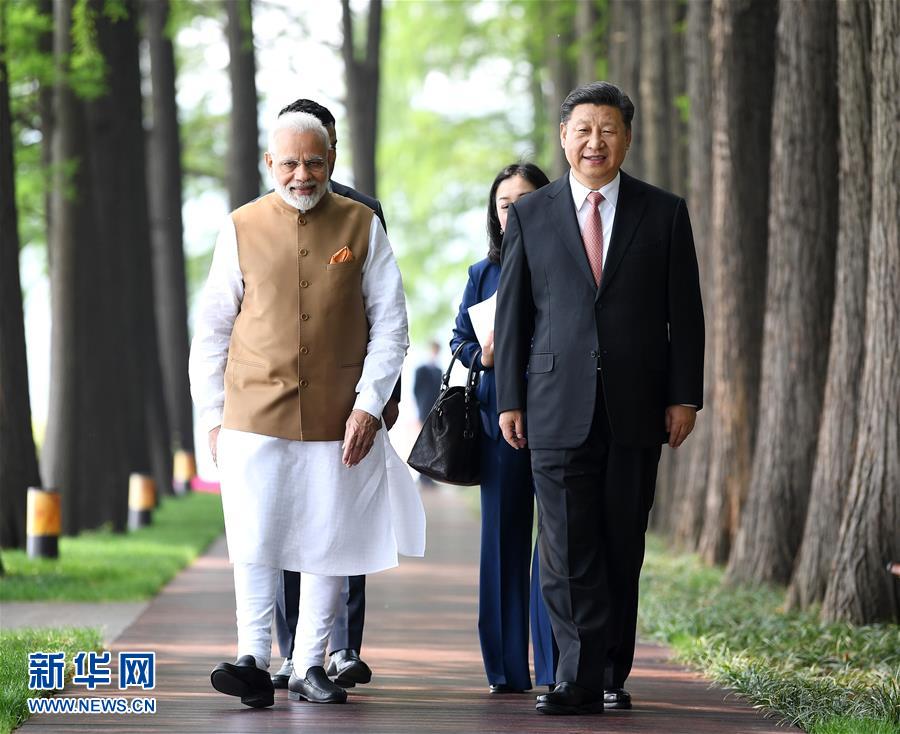 4月27日和28日,國家主席習近平在武漢東湖賓館同印度總理莫迪舉行非正式會晤。這是4月28日,習近平同莫迪散步交談。新華社記者 燕雁攝
