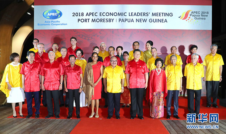 11月17日,國家主席習近平在莫爾茲比港出席巴布亞新幾內亞總理奧尼爾和夫人為出席亞太經合組織第二十六次領導人非正式會議的各成員經濟體領導人、代表及配偶舉行的歡迎晚宴。這是晚宴前集體合影。 新華社記者 謝環馳 攝