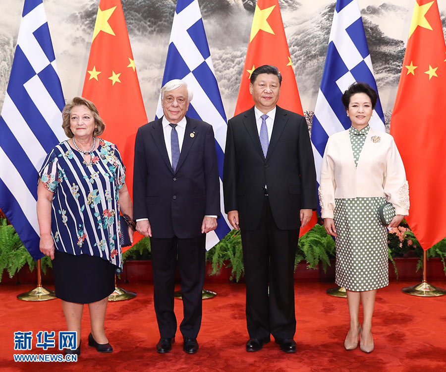 5月14日,國家主席習(xí)近平在北京人民大會(huì)堂同希臘總統(tǒng)帕夫洛普洛斯舉行會(huì)談。這是習(xí)近平和夫人彭麗媛同帕夫洛普洛斯夫婦合影。 新華社記者 鞠鵬 攝