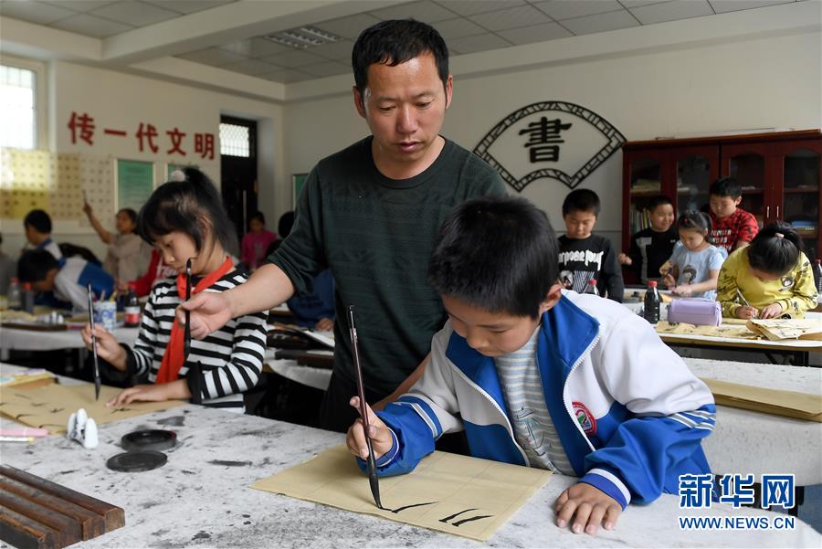 陜西省延安市楊家嶺福州希望小學書法社團的學生在老師指導下練習書法(4月24日攝)。新華社記者 劉瀟 攝