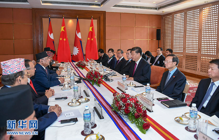 10月13日,國家主席習近平在加德滿都下榻飯店會見尼泊爾共產黨聯合主席普拉昌達。 新華社記者 謝環馳 攝
