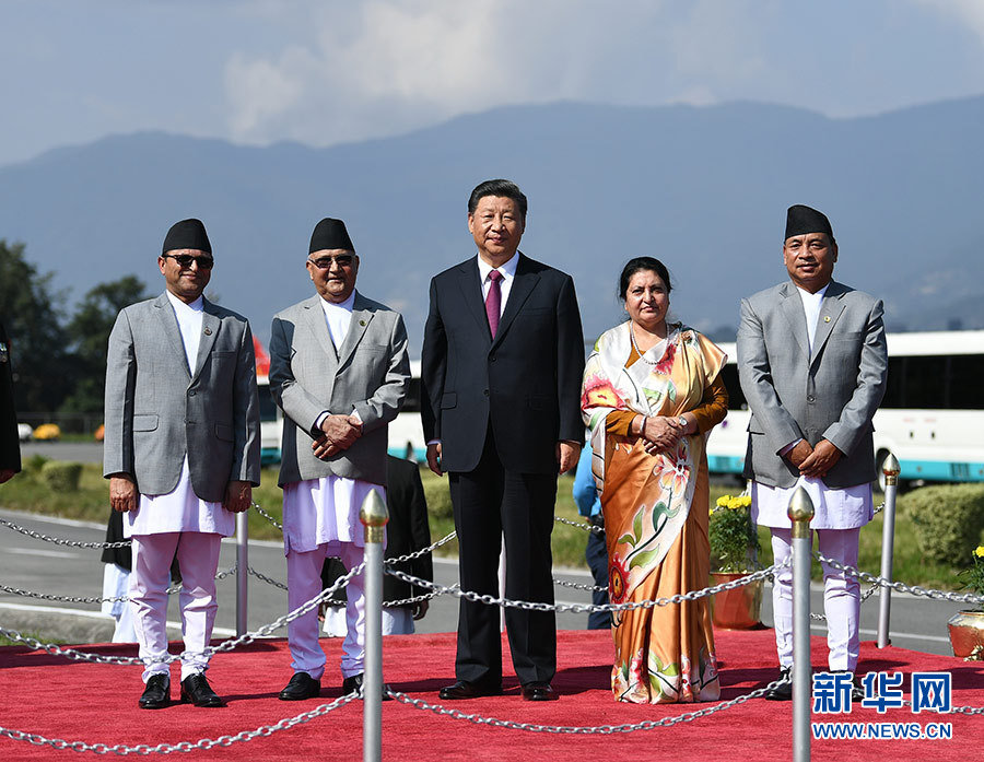 當?shù)貢r間10月13日中午,國家主席習近平離開加德滿都啟程回國。尼泊爾總統(tǒng)班達里在機場為習近平舉行隆重歡送儀式。尼泊爾副總統(tǒng)普恩、總理奧利、聯(lián)邦議會聯(lián)邦院主席蒂米爾西納、所有內(nèi)閣成員、軍方高級將領(lǐng)參加。 新華社記者 謝環(huán)馳 攝