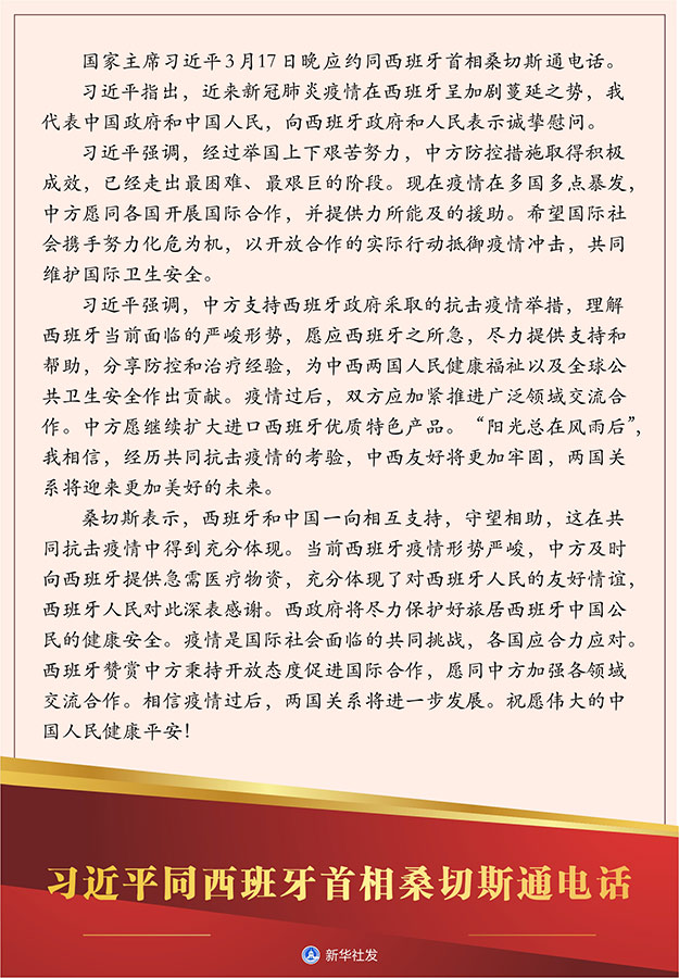 習(xí)近平強(qiáng)調(diào),中方支持西班牙政府采取的抗擊疫情舉措,理解西班牙當(dāng)前面臨的嚴(yán)峻形勢,愿應(yīng)西班牙之所急,盡力提供支持和幫助,分享防控和治療經(jīng)驗(yàn),為中西兩國人民健康福祉以及全球公共衛(wèi)生安全作出貢獻(xiàn)。疫情過后,雙方應(yīng)加緊推進(jìn)廣泛領(lǐng)域交流合作。中方愿繼續(xù)擴(kuò)大進(jìn)口西班牙優(yōu)質(zhì)特色產(chǎn)品。“陽光總在風(fēng)雨后”,我相信,經(jīng)歷共同抗擊疫情的考驗(yàn),中西友好將更加牢固,兩國關(guān)系將迎來更加美好的未來。