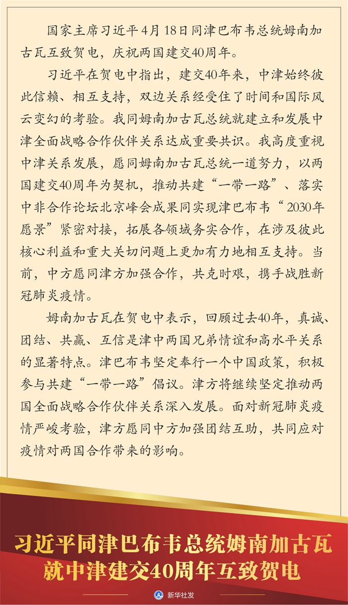 習(xí)近平同津巴布韋總統(tǒng)姆南加古瓦就中津建交40周年互致賀電