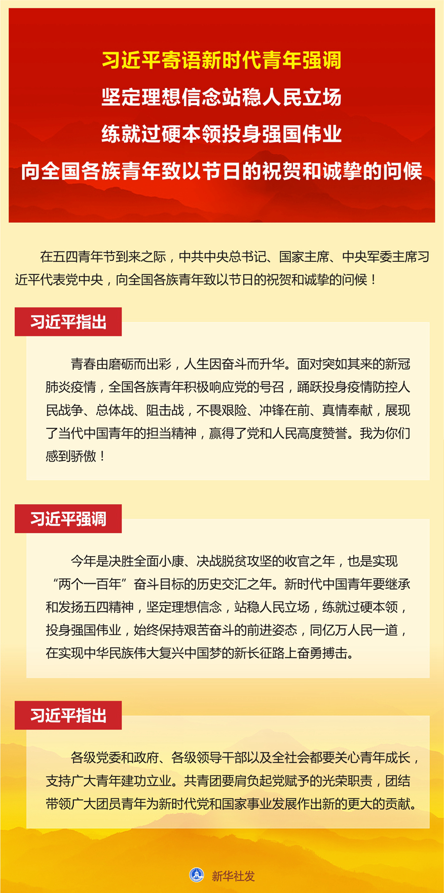 習近平強調,今年是決勝全面小康、決戰脫貧攻堅的收官之年,也是實現“兩個一百年”奮斗目標的歷史交匯之年。新時代中國青年要繼承和發揚五四精神,堅定理想信念,站穩人民立場,練就過硬本領,投身強國偉業,始終保持艱苦奮斗的前進姿態,同億萬人民一道,在實現中華民族偉大復興中國夢的新長征路上奮勇搏擊。