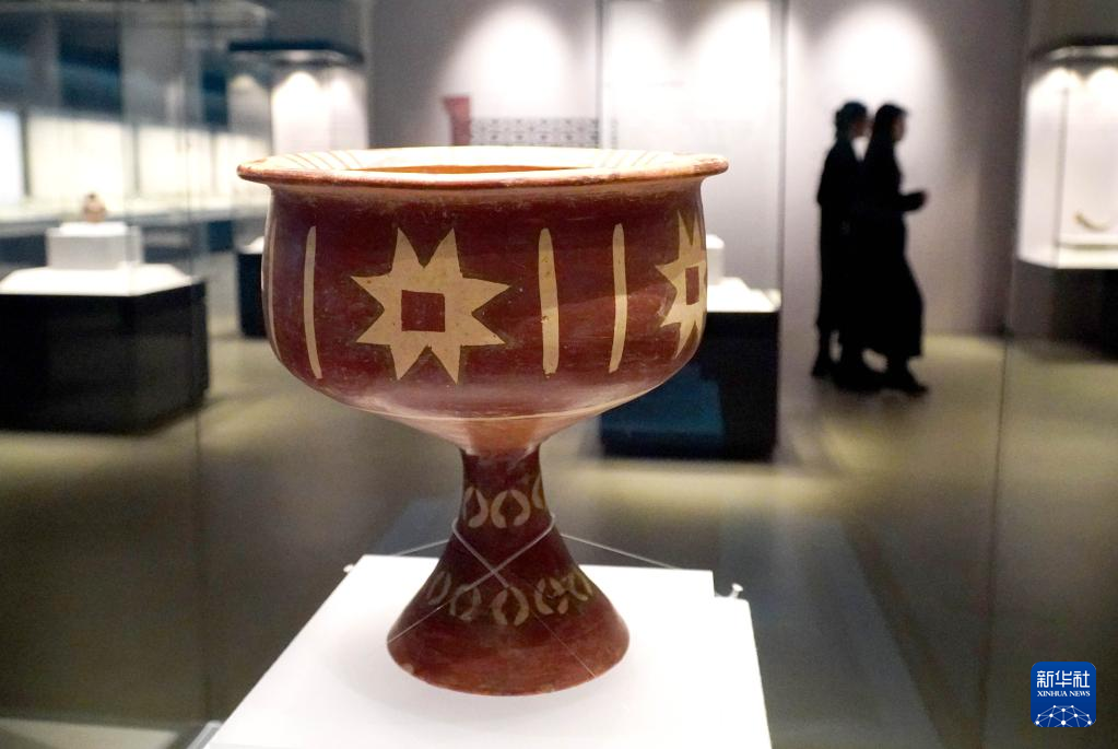 2月9日,在孔子博物馆举行的山东文物精品展上拍摄的山东省文物考古研究院收藏的大汶口文化八角星纹彩陶豆。