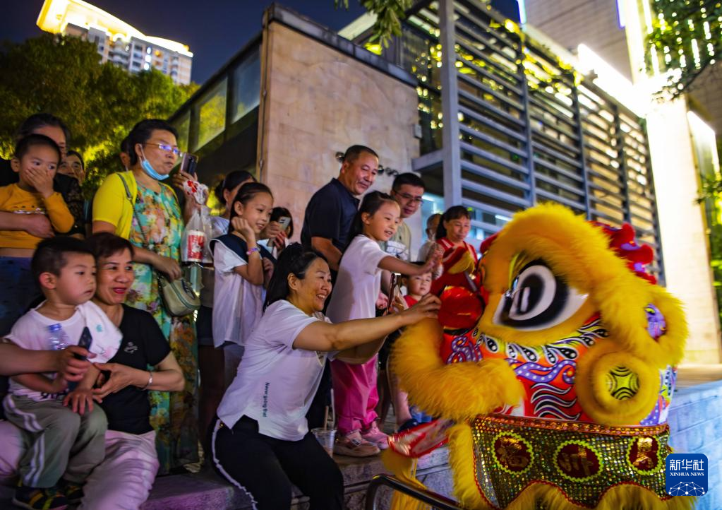 5月18日,在福州市台江区苍霞福街,舞狮表演者与福州市民和游客进行现场体验互动。
