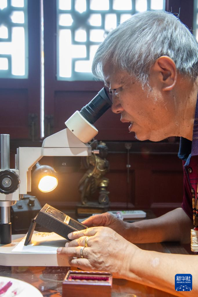 7月31日,潘启慧在通过显微镜观察微刻作品《清明上河图》。这件作品是在长5.29厘米、宽0.24厘米的动物骨头上仿刻《清明上河图》。