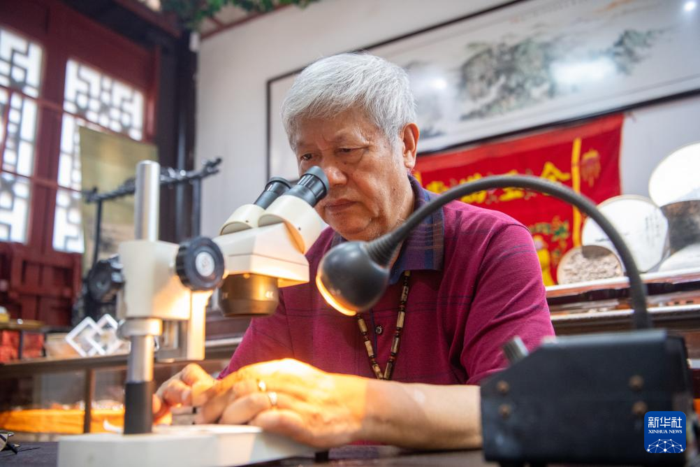 7月31日,潘启慧在调整显微镜准备创作微刻作品。