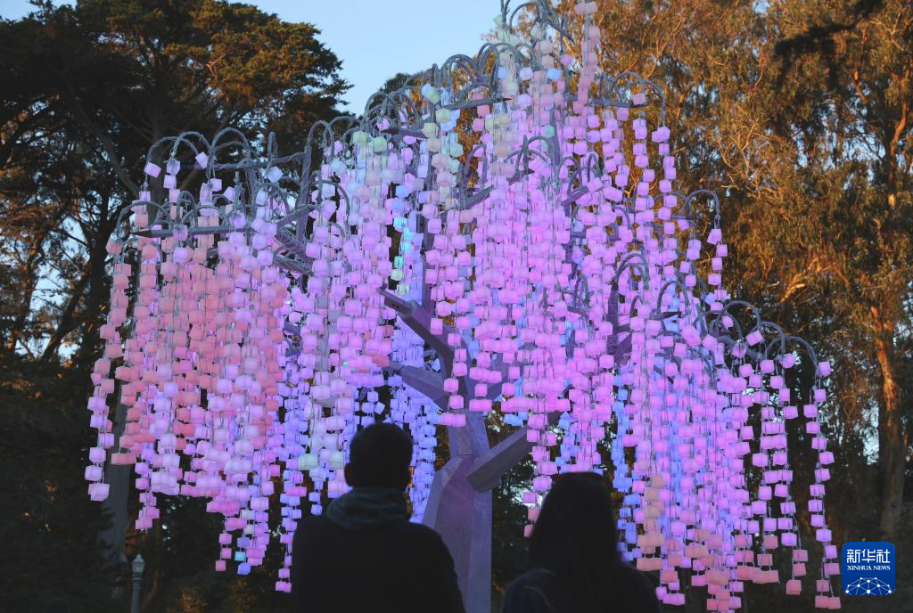 12月23日,人们在美国旧金山的金门公园观赏灯饰。