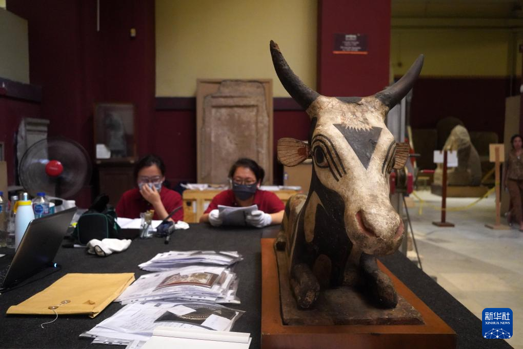 5月23日,在位于埃及首都开罗的埃及国家博物馆,上海博物馆的工作人员对一件木乃伊棺盖进行检查。