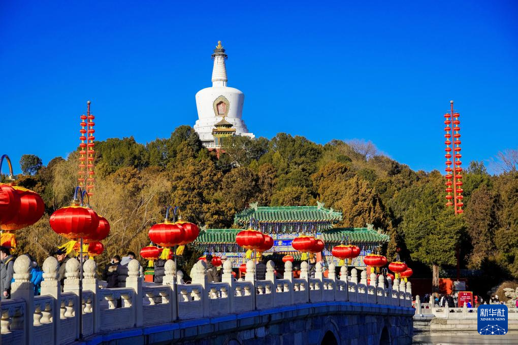 1月19日,河南省开封市龙亭湖风景区工人在悬挂红灯笼。
