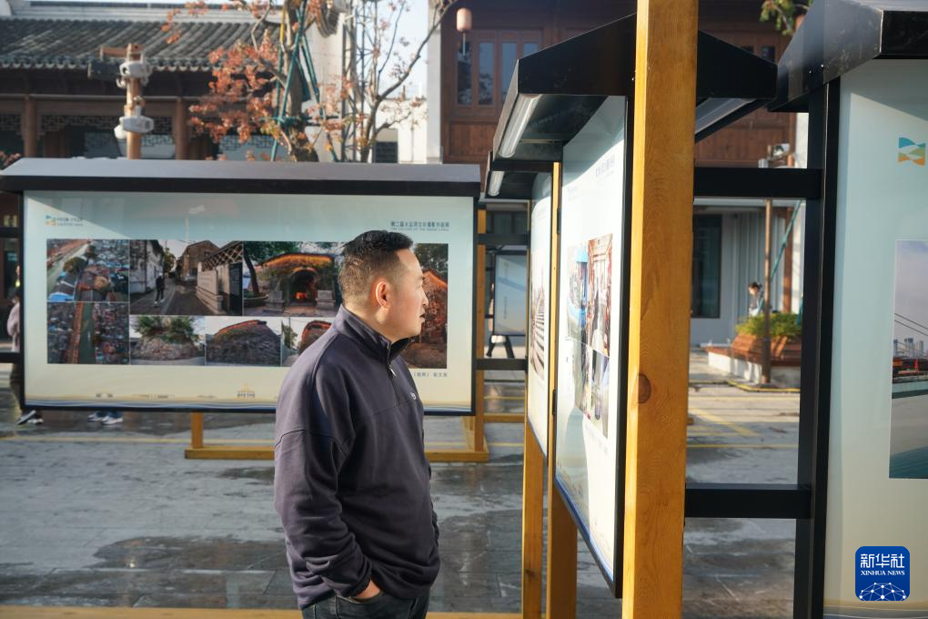 11月23日,一位老人在第二届大运河文化摄影展现场驻足参观。
