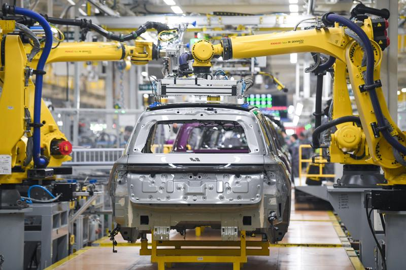 理想汽车常州基地的机器人在安装车窗玻璃。新华社记者 李博 摄