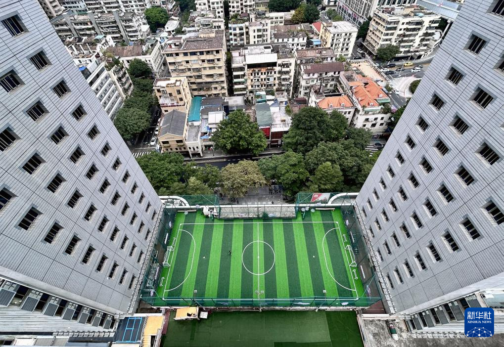 这是11月3日拍摄的位于广州市越秀区江湾阳光天地的麦斐体育足球场,该足球场是由两栋楼间的天台改造而成。