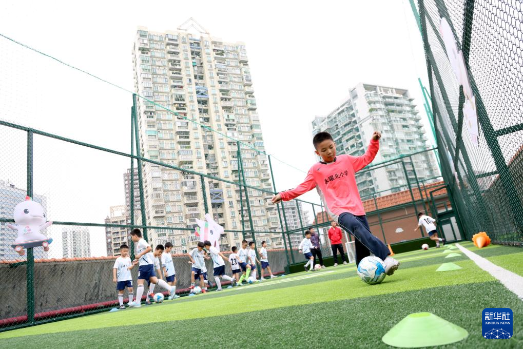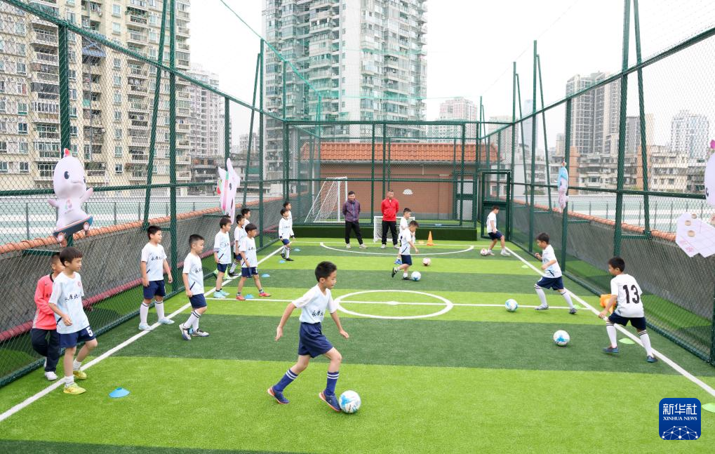 11月3日,广州市永曜北小学的学生在学校楼顶天台的足球场踢球。
