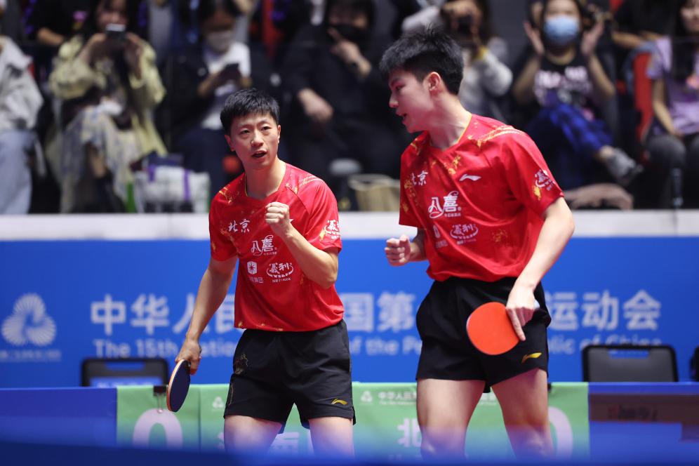 11月14日,北京队组合马龙/黄友政(右)在男双比赛中庆祝。新华社记者 梁旭 摄