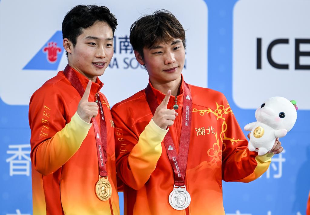 11月10日,获得第十五届全国运动会跳水男子3米跳板冠军的湖北队选手王宗源(左)与获得银牌的队友郑九源在颁奖仪式上合影。新华社记者 肖艺九 摄