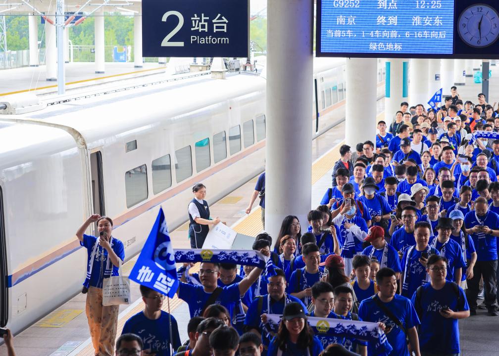 6月14日,铁路部门开行南京站往返淮安东站的长三角首趟“苏超”球迷高铁专列,方便南京球迷前往观赛。新华社发(苏阳 摄)