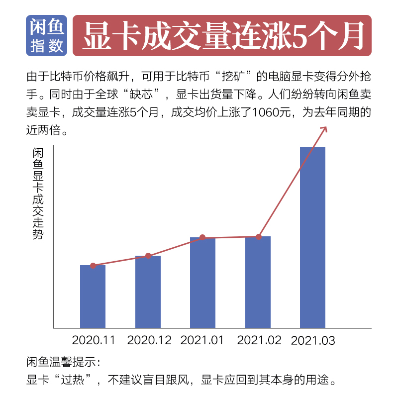 ????? 根據閑魚平臺數據顯示,顯卡成交呈現明顯的“量價齊升”現象。閑魚平臺上顯卡的成交量已經連漲5個月,僅在今年第一季度,顯卡成交量同比增長了338%,3月份更是呈飆升走勢。對此,平臺將設置“冷靜期”進行降溫處理,并呼吁用戶理性購買。