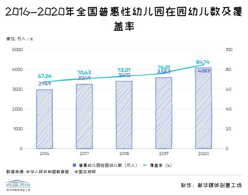 普惠性幼兒園覆蓋率逐年攀升,2020年中國普惠性幼兒園覆蓋率達84.74%,比2016年增加17.5個百分點(2016年開始統計普惠性幼兒園覆蓋率) ,超額完成《中共中央國務院關于學前教育深化改革規范發展的若干意見(2018年11月7日)》(后簡稱《意見》)中“到2020年,普惠性幼兒園覆蓋率(公辦園和普惠性民辦園在園幼兒占比)達到80%”的目標任務。