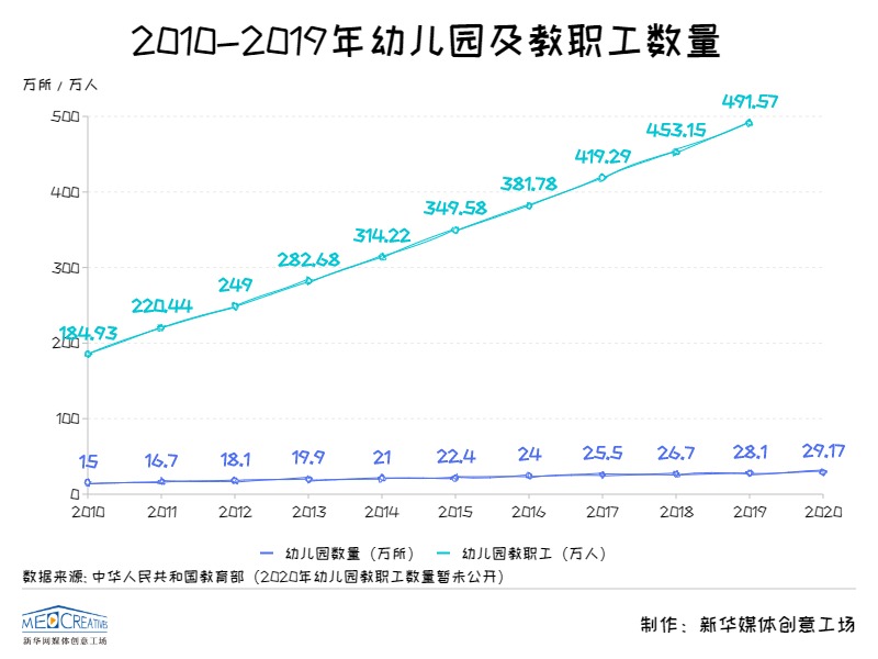 2020年,全國幼兒園總數達到29.17萬所,與2010年相比幾乎翻了一倍。于此同時,我國幼兒教師也逐漸增多,學歷層次逐年提高。2019年我國幼兒園教職工491.57萬人,比上年增加38.42萬人,增長8.48%。根據教育部最新數據顯示,2019年全國306.68萬幼兒園園長和專任教師中,本科及以上學歷的比例為25.75%,專科學歷的比例為57.83%,合計為83.58%。