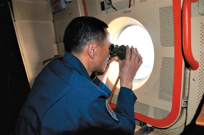 24日,中國空軍機組人員在任務海域搜索。 新華社發