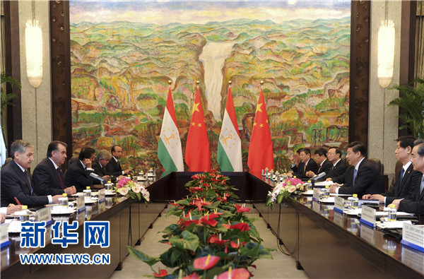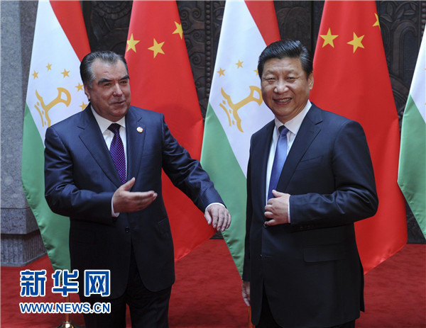 ????習(xí)近平表示,中方始終視塔吉克斯坦為好鄰居、好朋友、好伙伴,支持塔吉克斯坦維護(hù)國(guó)家穩(wěn)定、促進(jìn)經(jīng)濟(jì)發(fā)展、提高人民生活水平。去年中塔建立戰(zhàn)略伙伴關(guān)系以來(lái),兩國(guó)關(guān)系發(fā)展進(jìn)入新階段,各領(lǐng)域合作勢(shì)頭很好。雙方要加緊制定《中塔2015-2020年戰(zhàn)略伙伴關(guān)系合作綱要》,如期推進(jìn)中國(guó)-中亞天然氣管道工程以及塔方輸變電線(xiàn)路改造、交通和邊境口岸基礎(chǔ)設(shè)施建設(shè)、工業(yè)園、農(nóng)業(yè)技術(shù)示范園區(qū)等合作項(xiàng)目,促進(jìn)文化、教育、旅游合作,加強(qiáng)執(zhí)法安全和防務(wù)合作,共同打擊“三股勢(shì)力”、販毒和跨國(guó)犯罪。中方全力支持和配合塔方辦好今年9月舉行的上海合作組織杜尚別峰會(huì),推動(dòng)本組織向團(tuán)結(jié)更緊密、合作更務(wù)實(shí)、行動(dòng)更有效的方向發(fā)展。