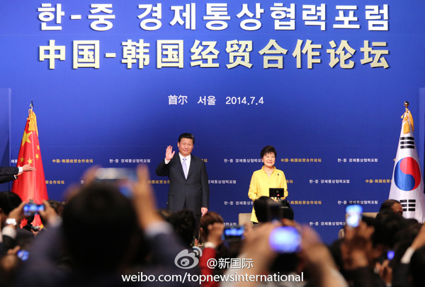 新華網北京7月4日電 據新華社“新國際”微博報道,習近平表示,中韓應共同反對保護主義,兩國企業可以在制定國際標準、開拓國際市場、參與區域一體化進程等方面加強探討、拓展合作。中方歡迎韓國參與亞洲基礎設施投資銀行籌建,共同推動地區互聯互通和基礎設施建設。