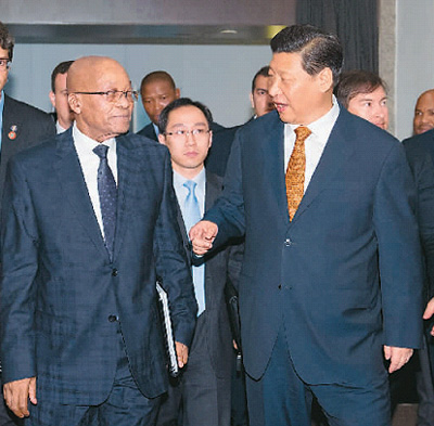 習近平表示,當前,中南關系正面臨重要發展機遇期,合作潛力巨大,我們應該乘勢而上,努力推動中南關系再上新臺階。我歡迎祖馬總統下半年訪華,共同制定未來合作規劃。雙方要積極開展能源、礦業、農業、裝備制造、基礎設施建設、鐵路機車、核電等領域合作,中方愿繼續配合南非辦好2014年中國南非年活動。