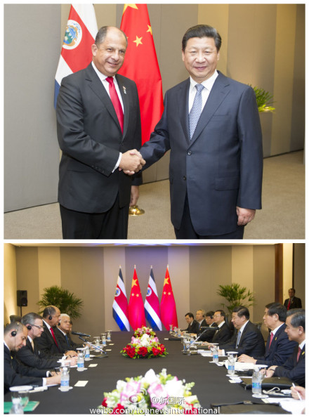 ??? 新華網北京7月17日電 據新華社“新國際”微博報道,習近平主席16日會見哥斯達黎加總統索利斯時說,中哥關系正如一棵茁壯成長的美洲象耳樹。中方愿繼續同哥方一道,把政治互信的根扎深,把互利合作的干養壯,使人文交流的葉繁茂,使中哥關系這棵大樹果實累累。(攝影:謝環馳)?