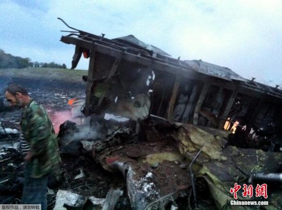 7月17日,據路透社消息,馬來西亞一架載有295人的777客機在烏克蘭靠近俄羅斯邊界墜毀。另據國際文傳電訊社消息,墜毀機型為一架波音777客機,機載約280名乘客和15個機組人員。圖為馬航波音777客機在頓涅茨克地區墜毀的現場。