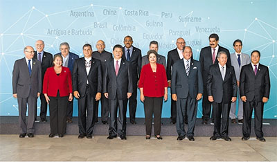 ? 當(dāng)?shù)貢r間7月17日下午,中國—拉美和加勒比國家領(lǐng)導(dǎo)人會晤在巴西利亞舉行。本次會晤由中方倡議,中國國家主席習(xí)近平、巴西總統(tǒng)羅塞夫、哥斯達(dá)黎加總統(tǒng)索利斯、古巴國務(wù)委員會主席兼部長會議主席勞爾·卡斯特羅、厄瓜多爾總統(tǒng)科雷亞、蘇里南總統(tǒng)鮑特塞、哥倫比亞總統(tǒng)桑托斯、智利總統(tǒng)巴切萊特、圭亞那總統(tǒng)拉莫塔爾、烏拉圭總統(tǒng)穆希卡、委內(nèi)瑞拉總統(tǒng)馬杜羅、安提瓜和巴布達(dá)總理布朗等出席。