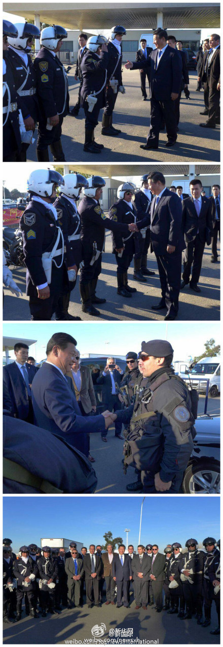 ????新華網(wǎng)北京7月21日電 據(jù)新華社“新國(guó)際”微博報(bào)道,43小時(shí)的阿根廷之旅,佩戴頭盔、全副武裝的騎警們一路護(hù)衛(wèi),十分辛苦。20日上午,訪問即將結(jié)束,車隊(duì)來(lái)到埃塞伊薩國(guó)際機(jī)場(chǎng)外,得知騎警們按規(guī)定不進(jìn)機(jī)場(chǎng),習(xí)近平臨時(shí)要求停車,來(lái)到騎警們面前,同他們一一握手道別表示感謝,并合影。?