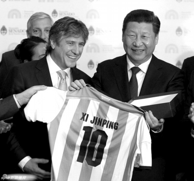 ????在和阿根廷副總統兼參議長布杜及眾議長多明格斯舉行會談時,習近平特別提到阿根廷足球隊在世界杯奪得亞軍,他說:“剛才眾議長先生問我是否喜歡足球,我說我非常喜歡足球。他也祝愿中國能夠早日舉辦一屆世界杯,這正是我的愿望。但是我們足球的發展,還希望同阿根廷加強交流合作,靠你們的幫助,提高我們的水平?!?/p>