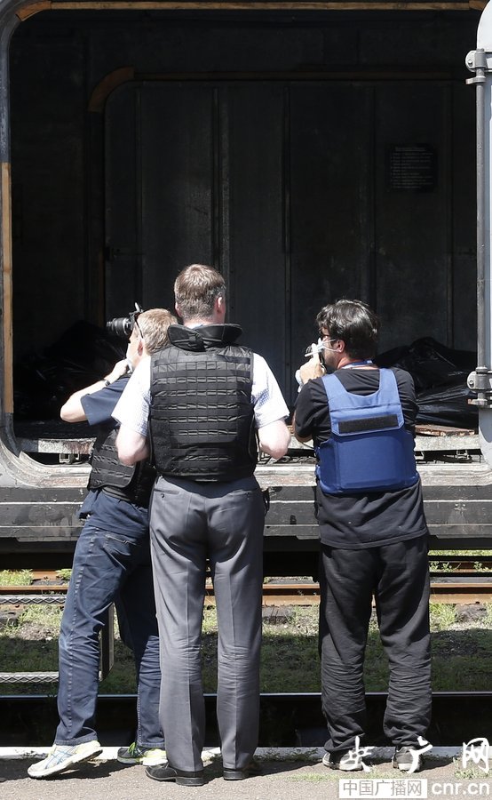 當(dāng)?shù)貢r(shí)間2014年7月20日,烏克蘭頓涅茨克Torez,馬航墜機(jī)遇難乘客遺體被裝上列車?yán)洳剀噹麑⒈贿\(yùn)走。載有部分遺體的火車從距空難現(xiàn)場(chǎng)不遠(yuǎn)的烏克蘭托列茲市出發(fā),前往頓涅茨克市。火車離站前,身處空難現(xiàn)場(chǎng)的歐洲安全與合作組織(歐安組織)代表檢查了運(yùn)載遺體的5節(jié)冷藏車廂。