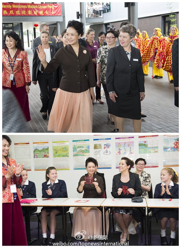 ??? 新華網北京11月19日電 據新華社“新國際”微博報道,習近平主席夫人彭麗媛19日在悉尼參觀育文武女子學校,在舞龍隊引導下來到孔子課堂。“白日依山盡……”16名女孩朗誦《登鸛雀樓》,還學打中國結、制作剪紙、繡織漢字“中澳友誼長存”。彭麗媛拿起剪刀,剪出一個“福”字。?
