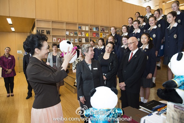 ??? 桌上擺放著彭麗媛向學校贈送的中英文雙語書籍和幾只毛茸茸大熊貓玩具。她拿起一只對孩子們說:“這是大家最喜歡的大熊貓。我這幾天抱了考拉、袋獾,它們非常可愛。大熊貓是中國國寶,也很可愛。希望你們學好中文,到中國去,看看真正的大熊貓。”