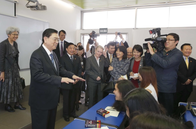 ??? 22日,全國人大常委會委員長張德江參觀秘魯里卡多·帕爾瑪大學孔子學院,與在這里學習中文的秘魯學生交流。