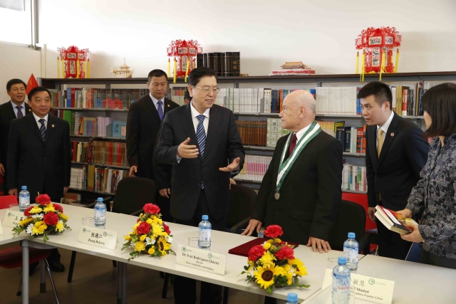 ??? 校長羅德里格斯向張德江介紹了這所孔子學院成立4年多來的發展情況,并向張德江贈書。