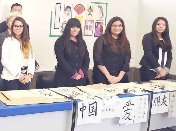 ??? 隨后,張德江走進一間教室,這里掛著紅紅的“中國結”、燈籠,墻上貼著一幅對聯“根深則葉茂,源遠而流長”。學生們有的在看中文書、有的在剪紙、還有的在練書法。